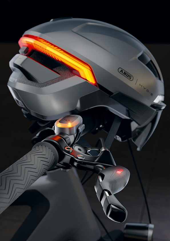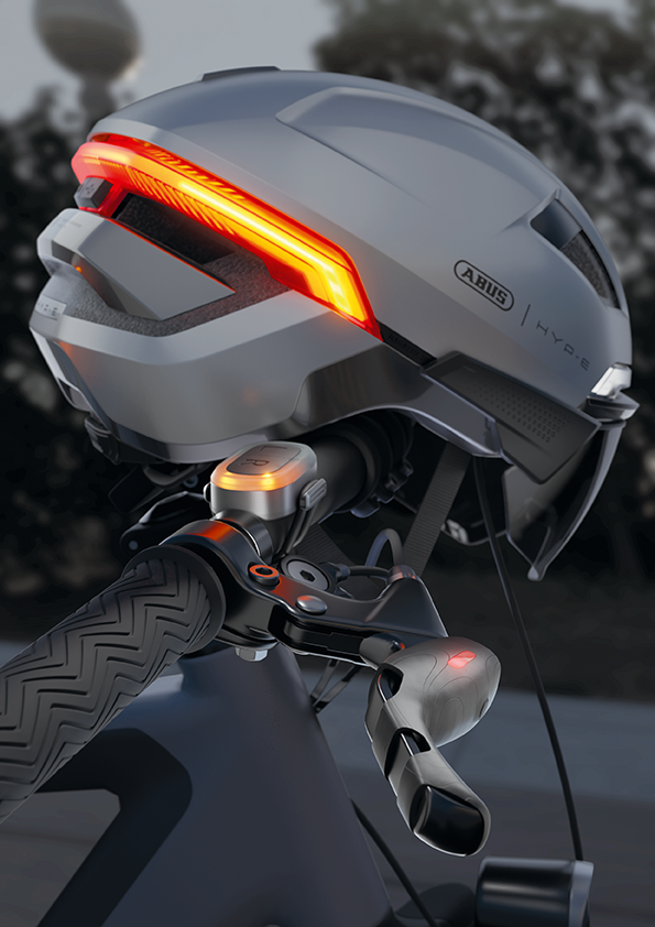 Um die Wahrnehmung und damit die Sicherheit weiter zu erhöhen, verfügt der HYP-E über weitere Funktionalitäten, die bisher vor allem von motorisierten Fahrzeugen bekannt sind. Dazu gehören ein Richtungsanzeiger, also ein Blinker, sowie ein innovatives Bremslicht. Die Bedienung dieser beiden Funktionen erfolgt dabei über eine Fernbedienung direkt durch den Fahrer, der durch die manuelle Schaltung die volle Kontrolle über seine Aktionen behält. Die Fernbedienung des Blinkers lässt sich individuell an der gewünschten Position am Lenker anbringen. Beim Betätigen gibt die Bedienung Feedback über die integrierten LEDs zur eingestellten Richtung. Optional lässt sich das vom Auto bekannte Blinker-Geräusch aktivieren. Das Bremslicht wird einfach und komfortabel über den bestehenden Bremshebel aktiviert. Ermöglicht wird dies über einen Sensor, der über den Bremshebel gezogen wird und bei Betätigung einen Impuls an den Helm gibt. Somit ist gewährleistet, dass das Bremslicht nur beim Bremsen aktiviert wird und Fehlfunktionen vermieden werden. Als Add on verfügt er über einen Knopf für eine Lichthupenfunktion in den Frontleuchten des HYP-E. Beide Fernbedienungen verfügen über eine USB-Ladeoption, der Akku-Status lässt sich jederzeit ablesen.
